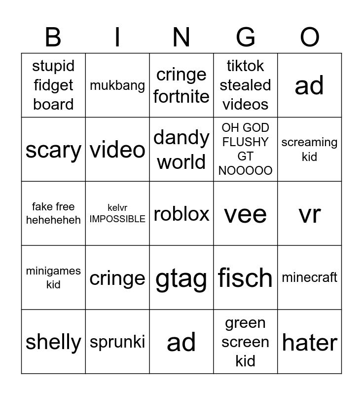 This bingo card has a free space and 24 words: cringe, sprunki, dandy world, shelly, ad, stupid fidget board, scary, mukbang, vee, gtag, OH GOD FLUSHY GT NOOOOO, fake free heheheheh, fisch, minecraft, video, green screen kid, vr, cringe fortnite, screaming kid, kelvr IMPOSSIBLE, hater, minigames kid, tiktok stealed videos and ad.