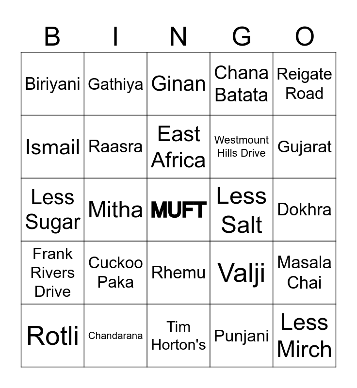 This bingo card has a free space and 24 words: Cuckoo Paka, Chandarana, East Africa, Rotli, Reigate Road, Biriyani, Ismail, Gathiya, Less Salt, Rhemu, Westmount Hills Drive, Less Sugar, Valji, Masala Chai, Raasra, Punjani, Dokhra, Ginan, Gujarat, Mitha, Less Mirch, Frank Rivers Drive, Chana Batata and Tim Horton's.