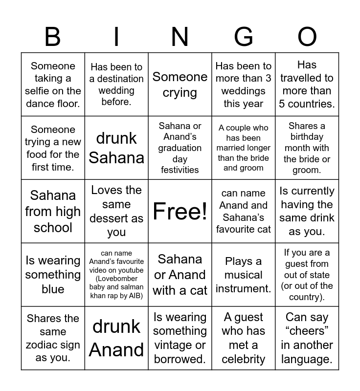 This bingo card has a free space and 40 words: Get a picture of, Sahana from high school, Anand from University, drunk Sahana, drunk Anand, Sahana or Anand with a cat, Sahana or Anand’s graduation day festivities, Find Someone Who...", Has travelled to more than 5 countries., Is wearing something blue, Loves the same dessert as you, Has been to more than 3 weddings this year, Can say “cheers” in another language., Is currently having the same drink as you., can name Anand and Sahana’s favourite cat, can name Anand’s favourite video on youtube (Lovebomber baby and salman khan rap by AIB), "Spot These moments/People…", Someone taking a selfie on the dance floor., Someone tearing it up on the dance floor., Someone crying, If you are a guest from out of state (or out of the country)., A guest who has met a celebrity, A couple who has been married longer than the bride and groom, Someone trying a new food for the first time., "Find a Guest Who...", Is related to the bride or groom., Knows how the bride and groom first met., Has a connection to the wedding venue (e.g., lives nearby or has been here before)., Knows the couple’s honeymoon destination., Got engaged or married this year., Travelled by plane to get to the wedding., Shares the same zodiac sign as you., Speaks more than two languages., Plays a musical instrument., Shares a birthday month with the bride or groom., Is wearing something vintage or borrowed., Got ready for this wedding in under 30 minutes., Has had a job in the same industry as you., Has been to a destination wedding before. and Is wearing the same colour as the bride or groom.