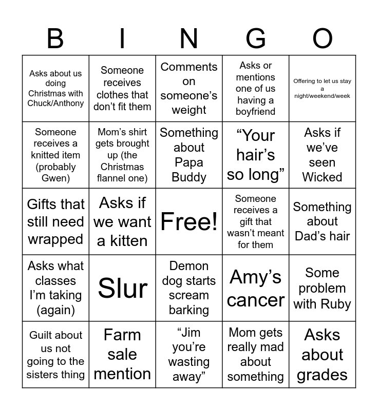 This bingo card has a free space and 24 words: Slur, Farm sale mention, Something about Papa Buddy, Guilt about us not going to the sisters thing, Offering to let us stay a night/weekend/week, Asks about us doing Christmas with Chuck/Anthony, Someone receives a knitted item (probably Gwen), Someone receives clothes that don’t fit them, Someone receives a gift that wasn’t meant for them, Demon dog starts scream barking, “Your hair’s so long”, Gifts that still need wrapped, Amy’s cancer, Some problem with Ruby, Mom’s shirt gets brought up (the Christmas flannel one), Mom gets really mad about something, Something about Dad’s hair, Comments on someone’s weight, Asks if we’ve seen Wicked, Asks if we want a kitten, Asks about grades, Asks what classes I’m taking (again), Asks or mentions one of us having a boyfriend and “Jim you’re wasting away”.