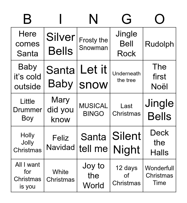 This bingo card has a free space and 24 words: All I want for Christmas is you, Feliz Navidad, Let it snow, 12 days of Christmas, Rudolph, Here comes Santa, Silver Bells, Frosty the Snowman, Last Christmas, Jingle Bells, Little Drummer Boy, Santa Baby, Silent Night, Deck the Halls, Baby it’s cold outside, White Christmas, Joy to the World, Jingle Bell Rock, The first Noël, Holly Jolly Christmas, Mary did you know, Santa tell me, Underneath the tree and Wonderfull Christmas Time.