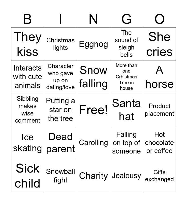 This bingo card has a free space and 24 words: Dead parent, Snowball fight, Snow falling, Sick child, She cries, They kiss, Interacts with cute animals, Christmas lights, Santa hat, Carolling, More than one Crhistmas Tree in house, Sibbling makes wise comment, Falling on top of someone, Hot chocolate or coffee, Character who gave up on dating/love, Jealousy, Product placement, Eggnog, A horse, Putting a star on the tree, Gifts exchanged, Ice skating, The sound of sleigh bells and Charity.
