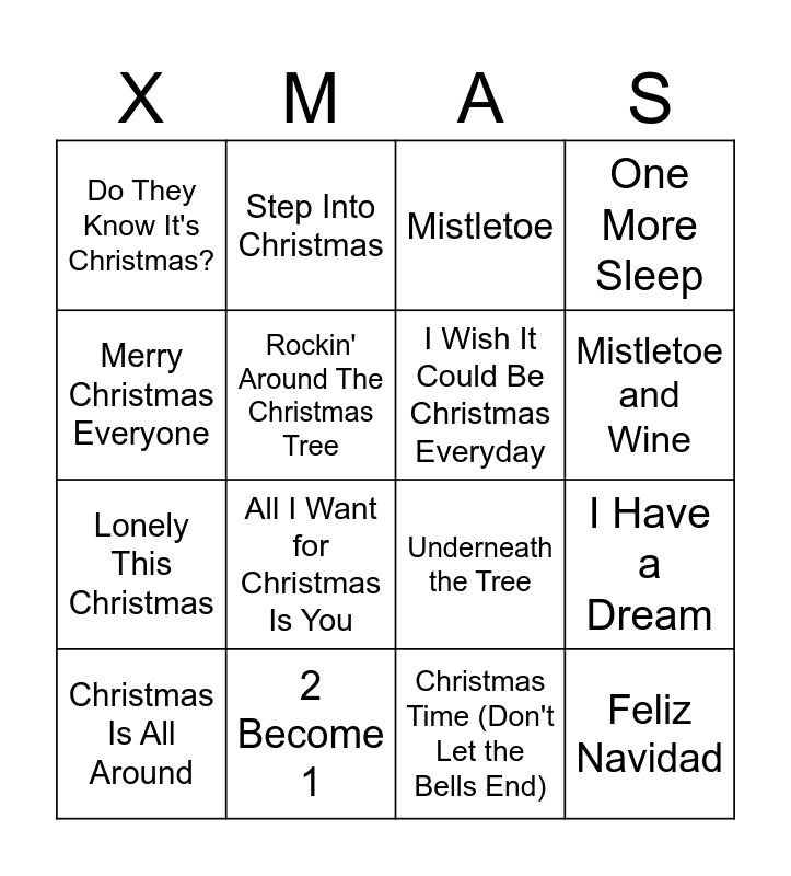 This bingo card has 27 words: Last Christmas, Wonderful Christmastime, Lonely This Christmas, Jingle Bell Rock, Rockin' Around The Christmas Tree, Mistletoe, Step Into Christmas, Feliz Navidad, 2 Become 1, Santa Tell Me, Underneath the Tree, One More Sleep, DJ Play A Christmas Song, Perfect, All I Want for Christmas Is You, Happy Xmas (War Is Over), I Wish It Could Be Christmas Everyday, Mistletoe and Wine, Stay Another Day, Do They Know It's Christmas?, Christmas Time (Don't Let the Bells End), Fairytale of New York, I Have a Dream, Christmas Is All Around, Santa Claus Is Coming To Town, Merry Christmas Everyone and Merry Xmas Everybody.