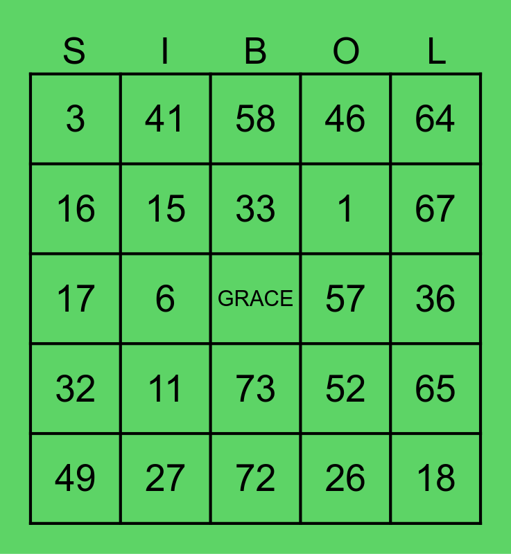 This bingo card has a free space and 24 words: 11, 27, 33, 49, 64, 3, 16, 41, 57, 73, 1, 17, 52, 65, 15, 26, 36, 58, 67, 6, 18, 32, 46 and 72.