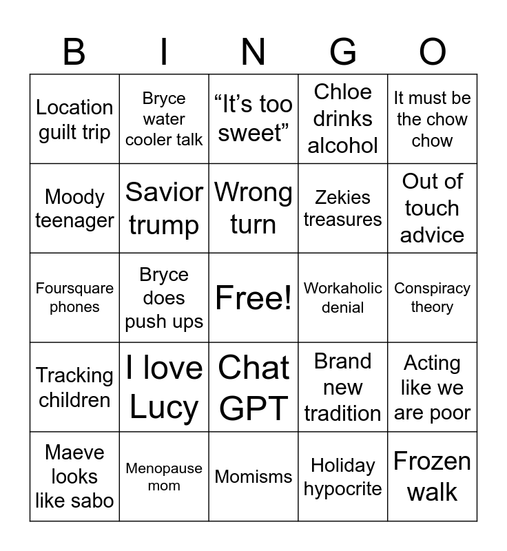 This bingo card has a free space and 24 words: I love Lucy, Menopause mom, Wrong turn, Maeve looks like sabo, It must be the chow chow, Location guilt trip, Moody teenager, Bryce water cooler talk, Workaholic denial, Chat GPT, Zekies treasures, Foursquare phones, Brand new tradition, Acting like we are poor, Savior trump, Holiday hypocrite, Conspiracy theory, “It’s too sweet”, Out of touch advice, Bryce does push ups, Frozen walk, Tracking children, Chloe drinks alcohol and Momisms.