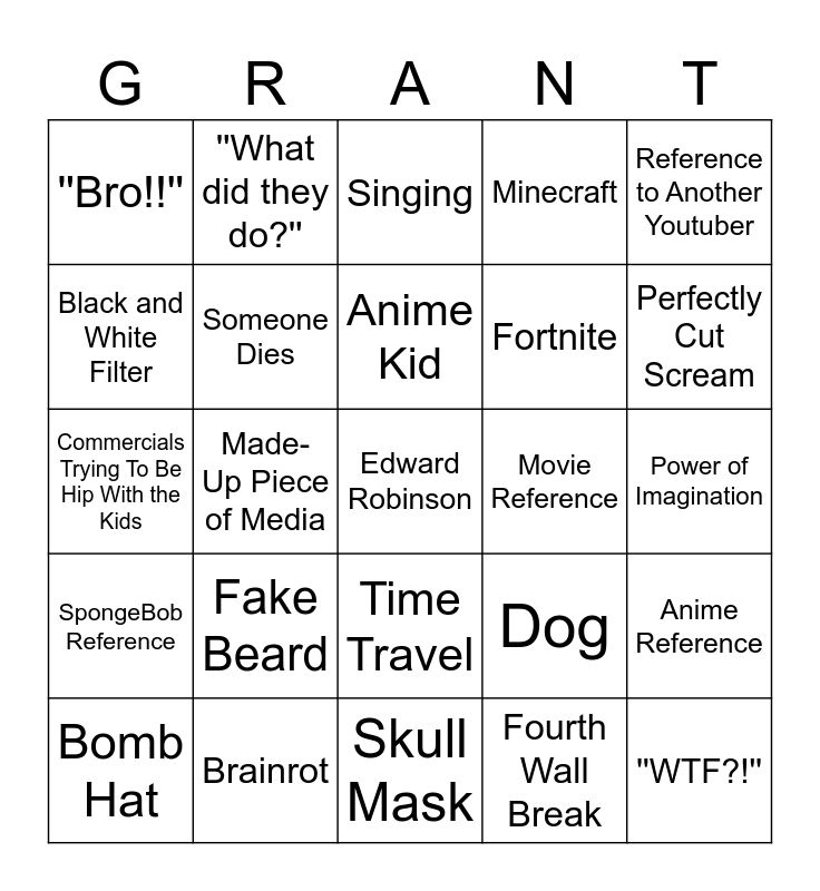 This bingo card has 25 words: SpongeBob Reference, Brainrot, Edward Robinson, Fourth Wall Break, Reference to Another Youtuber, ''Bro!!'', ''What did they do?'', Singing, Movie Reference, Anime Reference, Black and White Filter, Someone Dies, Skull Mask, Dog, Perfectly Cut Scream, Bomb Hat, Made-Up Piece of Media, Anime Kid, Fortnite, Power of Imagination, Commercials Trying To Be Hip With the Kids, Fake Beard, Time Travel, Minecraft and ''WTF?!''.