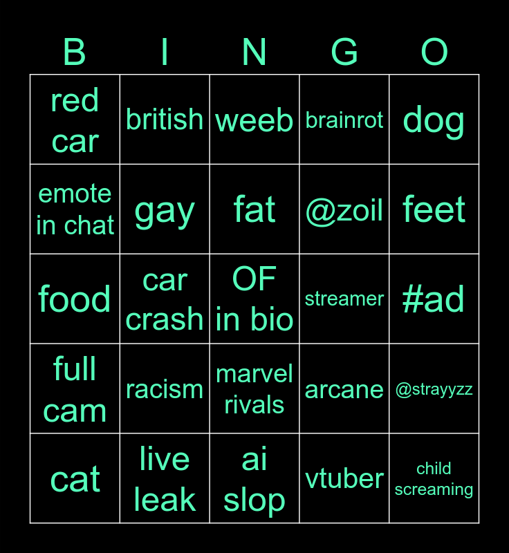 This bingo card has a free space and 24 words: racism, live leak, fat, cat, dog, red car, emote in chat, british, streamer, marvel rivals, @zoil, food, arcane, @strayyzz, gay, vtuber, #ad, weeb, feet, car crash, child screaming, full cam, brainrot and ai slop.