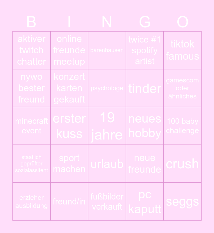 This bingo card has a free space and 24 words: sport machen, freund/in, psychologe, erzieher ausbildung, tiktok famous, aktiver twitch chatter, nywo bester freund, online freunde meetup, neues hobby, urlaub, tinder, minecraft event, neue freunde, crush, konzert karten gekauft, pc kaputt, 100 baby challenge, bärenhausen, gamescom oder ähnliches, erster kuss, seggs, staatlich geprüfter sozialassitent, twice #1 spotify artist and fußbilder verkauft.