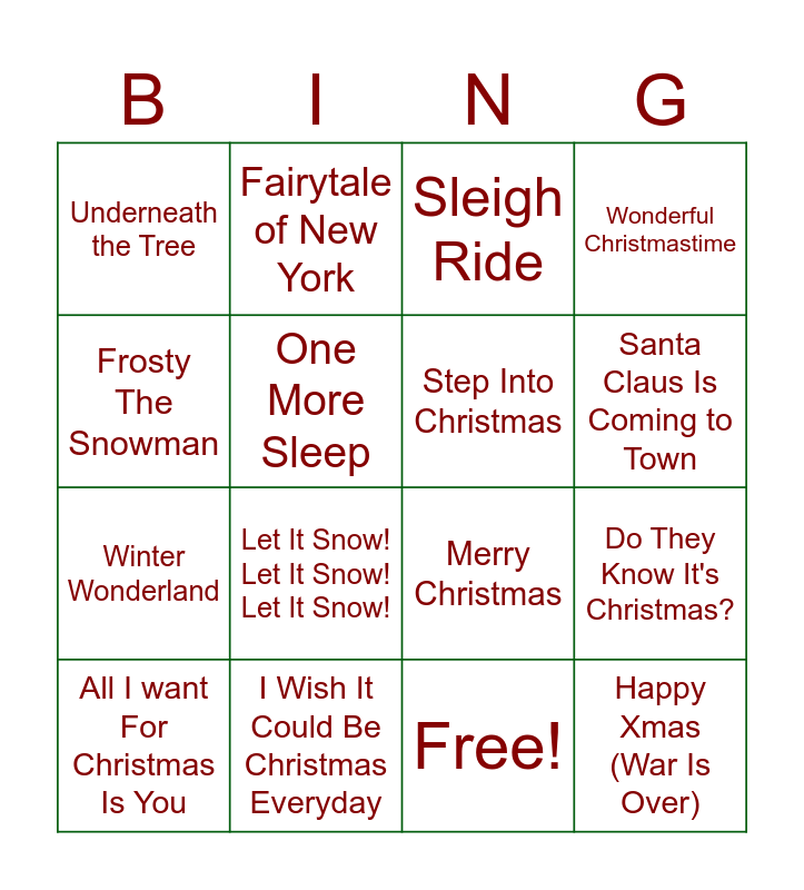 This bingo card has 17 words: Free!, All I want For Christmas Is You, Sleigh Ride, Underneath the Tree, Let It Snow! Let It Snow! Let It Snow!, Wonderful Christmastime, Do They Know It's Christmas?, Step Into Christmas, Santa Claus Is Coming to Town, One More Sleep, I Wish It Could Be Christmas Everyday, Merry Christmas, Frosty The Snowman, Fairytale of New York, Winter Wonderland, Carol of the Bells and Happy Xmas (War Is Over).
