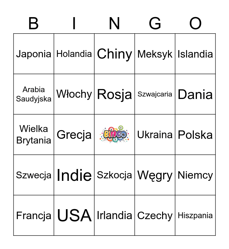 This bingo card has a free space and 24 words: Indie, USA, Rosja, Francja, Islandia, Japonia, Arabia Saudyjska, Holandia, Ukraina, Szkocja, Szwajcaria, Wielka Brytania, Węgry, Niemcy, Włochy, Czechy, Polska, Chiny, Dania, Grecja, Hiszpania, Szwecja, Meksyk and Irlandia.