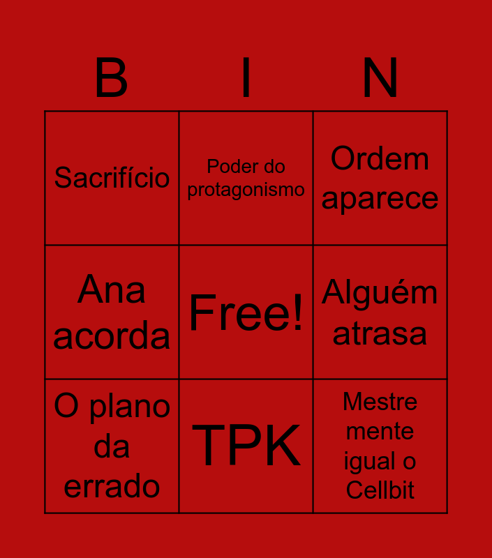 This bingo card has a free space and 8 words: Alguém atrasa, Ordem aparece, Poder do protagonismo, O plano da errado, Sacrifício, Mestre mente igual o Cellbit, Ana acorda and TPK.