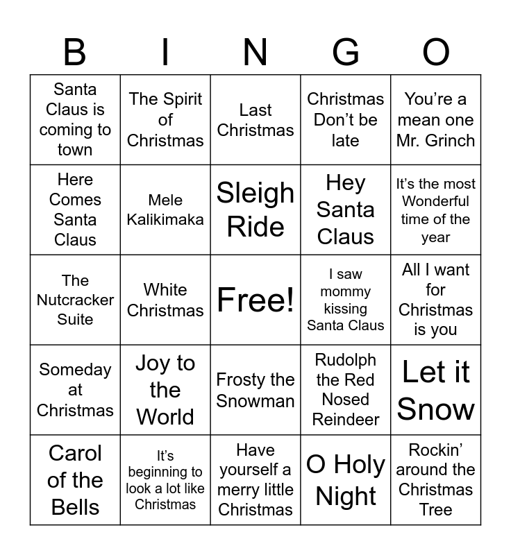 This bingo card has a free space and 30 words: It’s beginning to look a lot like Christmas, Winter Wonderland, White Christmas, Silver Bells, Santa Claus is coming to town, Last Christmas, Mele Kalikimaka, Frosty the Snowman, I saw mommy kissing Santa Claus, Have yourself a merry little Christmas, All I want for Christmas is you, Rockin’ around the Christmas Tree, O Holy Night, Feliz Navidad, It’s the most Wonderful time of the year, Blue Christmas, Rudolph the Red Nosed Reindeer, Someday at Christmas, Joy to the World, You’re a mean one Mr. Grinch, The Nutcracker Suite, Little Saint Nick, The Spirit of Christmas, Hey Santa Claus, Here Comes Santa Claus, Christmas Don’t be late, Let it Snow, Carol of the Bells, Sleigh Ride and Run Rudolph Run.
