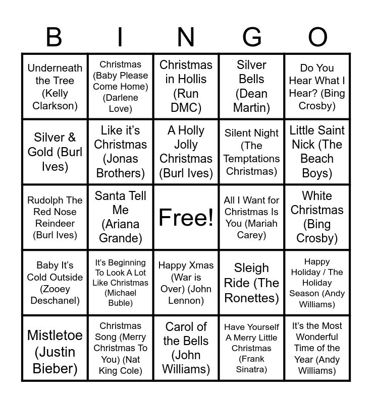 This bingo card has a free space and 29 words: Mistletoe (Justin Bieber), Last Christmas (Wham!), Santa Tell Me (Ariana Grande), Wonderful Christmastime (Paul McCartney), Underneath the Tree (Kelly Clarkson), Christmas in Hollis (Run DMC), Like it’s Christmas (Jonas Brothers), It’s Beginning To Look A Lot Like Christmas (Michael Buble), All I Want for Christmas Is You (Mariah Carey), Christmas Song (Merry Christmas To You) (Nat King Cole), White Christmas (Bing Crosby), It’s the Most Wonderful Time of the Year (Andy Williams), Carol of the Bells (John Williams), Have Yourself A Merry Little Christmas (Frank Sinatra), Little Saint Nick (The Beach Boys), Christmas Tree Farm (Taylor Swift), Happy Xmas (War is Over) (John Lennon), Baby It’s Cold Outside (Zooey Deschanel), Do You Hear What I Hear? (Bing Crosby), Rudolph The Red Nose Reindeer (Burl Ives), Sleigh Ride (The Ronettes), Linus & Lucy (Vince Guaraldi Trio), Silent Night (The Temptations Christmas), Silver & Gold (Burl Ives), Silver Bells (Dean Martin), Christmas (Baby Please Come Home) (Darlene Love), Happy Holiday / The Holiday Season (Andy Williams), A Holly Jolly Christmas (Burl Ives) and Fa La La (Boys II Men & Justin Bieber).