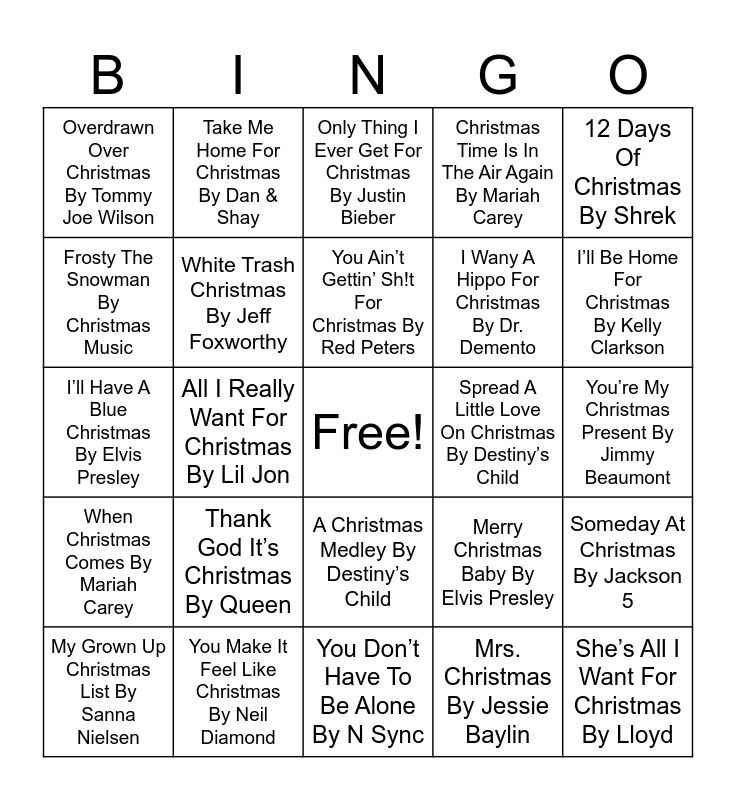 This bingo card has a free space and 24 words: Thank God It’s Christmas By Queen, You Make It Feel Like Christmas By Neil Diamond, You Ain’t Gettin’ Sh!t For Christmas By Red Peters, My Grown Up Christmas List By Sanna Nielsen, 12 Days Of Christmas By Shrek, Overdrawn Over Christmas By Tommy Joe Wilson, Frosty The Snowman By Christmas Music, Take Me Home For Christmas By Dan & Shay, Spread A Little Love On Christmas By Destiny’s Child, A Christmas Medley By Destiny’s Child, I Wany A Hippo For Christmas By Dr. Demento, I’ll Have A Blue Christmas By Elvis Presley, Merry Christmas Baby By Elvis Presley, Someday At Christmas By Jackson 5, White Trash Christmas By Jeff Foxworthy, Mrs. Christmas By Jessie Baylin, You’re My Christmas Present By Jimmy Beaumont, Only Thing I Ever Get For Christmas By Justin Bieber, I’ll Be Home For Christmas By Kelly Clarkson, All I Really Want For Christmas By Lil Jon, She’s All I Want For Christmas By Lloyd, When Christmas Comes By Mariah Carey, Christmas Time Is In The Air Again By Mariah Carey and You Don’t Have To Be Alone By N Sync.