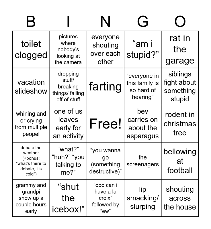 This bingo card has a free space and 29 words: grammy and grandpi show up a couple hours early, emmy texts me five times on the way there asking when we’re gonna be there, one of us leaves early for an activity, discussions of fruitcake, toilet clogged, everyone shouting over each other, dropping stuff/ breaking things/ falling off of stuff, “what?” “huh?” “you talking to me?”, bev carries on about the asparagus, “shut the icebox!”, rodent in christmas tree, shouting across the house, “ooo can i have a la croix” followed by “ew”, lip smacking/ slurping, siblings fight about something stupid, who sneezes in direct sunlight, “you wanna go (something destructive)”, debate the weather (+bonus: “what’s there to debate, it’s cold”), rat in the garage, whining and or crying from multiple peopel, the screenagers, “you gotta wear layers”, “everyone in this family is so hard of hearing”, vacation slideshow, “am i stupid?”, pictures where nobody’s looking at the camera, bellowing at football, farting and christmas vacation.