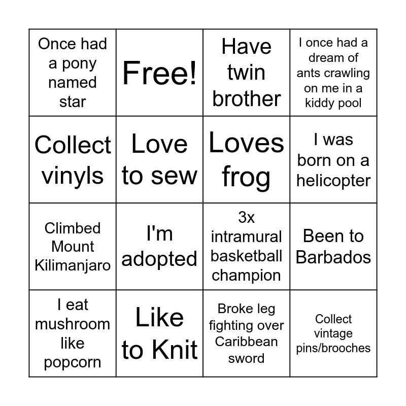 This bingo card has 19 words: 3x intramural basketball champion, I was born with an extra finger, Have twin brother, Collect vintage pins/brooches, Been to Barbados, Collect vinyls, Broke leg fighting over Caribbean sword, Once had a pony named star, Free!, Climbed Mount Kilimanjaro, I'm adopted, Love to sew, Loves frog, Like to Knit, I eat mushroom like popcorn, Loves Alpacas, I once had a dream of ants crawling on me in a kiddy pool, I was born on a helicopter and I played Varsity tennis in High school.