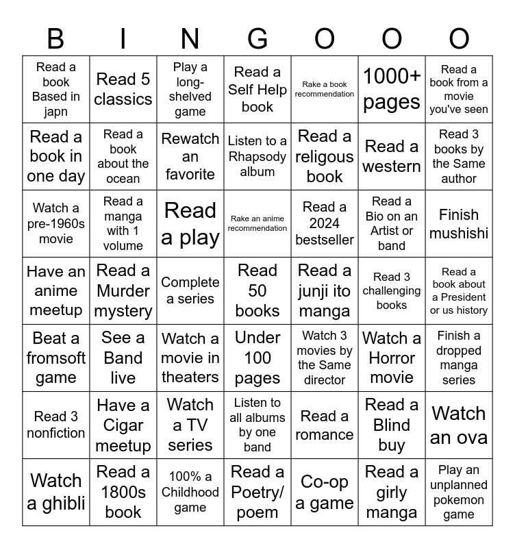 This bingo card has a free space and 48 words: Read a romance, Read a western, Read a Poetry/ poem, Read a Murder mystery, Read a play, Read a book about a President or us history, Read 5 classics, Read a 1800s book, 1000+ pages, Under 100 pages, Read a book from a movie you've seen, Read a Self Help book, Read a Bio on an Artist or band, Read a 2024 bestseller, Read 3 nonfiction, Read 3 challenging books, Read a book in one day, Read 3 books by the Same author, Read a Blind buy, Rake a book recommendation, Read a religous book, Complete a series, Read a book Based in japn, Read a book about the ocean, Watch an ova, Rewatch an favorite, Finish mushishi, Watch a ghibli, Rake an anime recommendation, Read a manga with 1 volume, Read a girly manga, Read a junji ito manga, Finish a dropped manga series, Have a Cigar meetup, Have an anime meetup, Watch 3 movies by the Same director, Watch a Horror movie, Watch a pre-1960s movie, Watch a movie in theaters, Watch a TV series, Beat a fromsoft game, Play an unplanned pokemon game, Play a long-shelved game, 100% a Childhood game, Listen to a Rhapsody album, Listen to all albums by one band, See a Band live and Co-op a game.