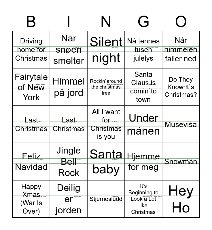 This bingo card has 24 images, a free space and 24 words: Jingle Bell Rock, Deilig er jorden, Rockin`around the christmas tree, Happy Xmas (War Is Over), Når himmelen faller ned, Driving home for Christmas, Fairytale of New York, Når snøen smelter, Under månen, Santa baby, Santa Claus is comin`to town, Last Christmas, Hjemme for meg, Snowman, Himmel på jord, It’s Beginning to Look a Lot like Christmas, Musevisa, Silent night, Do They Know It`s Christmas?, Last Christmas, Hey Ho, Feliz Navidad, Nå tennes tusen julelys and Stjernesludd.