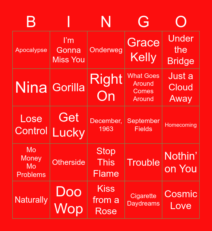 This bingo card has 49 words: Niet of Nooit Geweest, December, 1963, Somebody To Love, Kiss from a Rose, Otherside, Losing my Religion, I’m Gonna Miss You, Listen to the Music, Nina, Young, Wild & Free, Gorilla, Grace Kelly, Nothin’ on You, Trouble, De Manier, Losers, Right On, September Fields, I Keep Forgettin’, Under the Bridge, Get Lucky, Cigarette Daydreams, Apocalypse, What Goes Around Comes Around, Violet Crimes, Just a Cloud Away, Naturally, Isis, Stop This Flame, Mo Money Mo Problems, Stil in Mij, As, Spijt Is Voor Later, Wonderful Christmastime, Doo Wop, Tieduprightnow, Luther, Just Can’t Get Enough, Homecoming, POWER, When Love Takes Over, Glory Box, Cosmic Love, Get Down Saturday Night, Lose Control, Onderweg, California Dreamin’, Money and Stairway to Heaven.