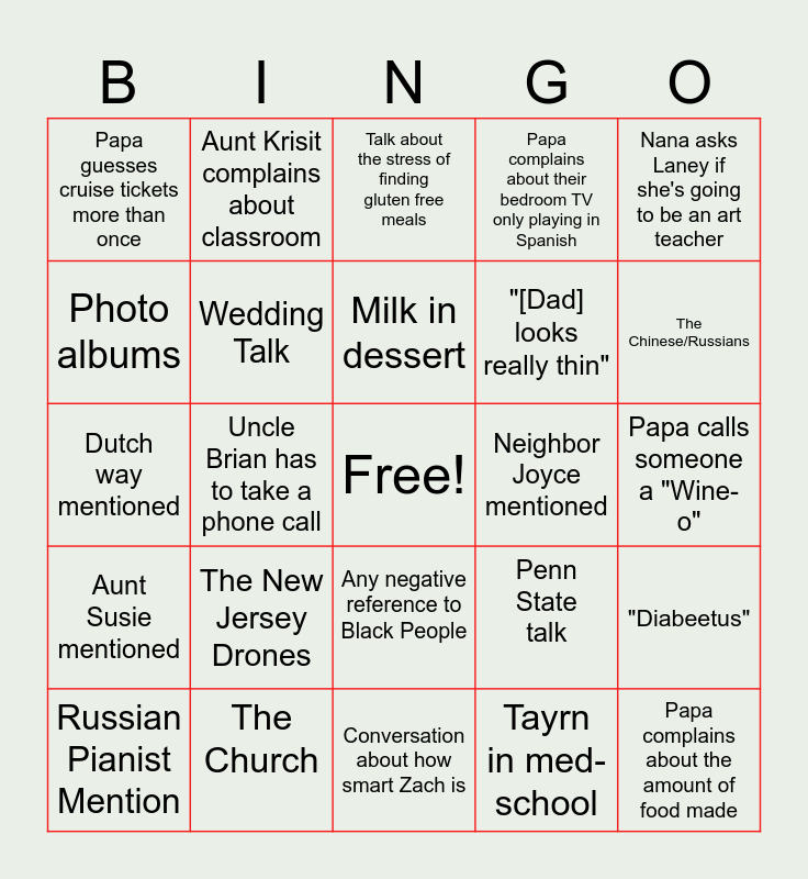 This bingo card has a free space and 29 words: Russian Pianist Mention, The word "Oriential" being used, Uncle Brian has to take a phone call, The gift card cheer occurs, Papa guesses cruise tickets more than once, Talk about the stress of finding gluten free meals, Wedding Talk, The New Jersey Drones, Neighbor Joyce mentioned, The Church, Papa calls someone a "Wine-o", Papa complains about the amount of food made, Conversation about how smart Zach is, Tayrn in med-school, The Chinese/Russians, Papa talks about his men's club, Any negative reference to Black People, Aunt Susie mentioned, Nana asks Laney if she's going to be an art teacher, Dutch way mentioned, Penn State talk, "James Franklin needs to be fired", "[Dad] looks really thin", Photo albums, Papa complains about their bedroom TV only playing in Spanish, Aunt Krisit complains about classroom, "Diabeetus", Milk in dessert and Facetime to the Florida Hibshmans.