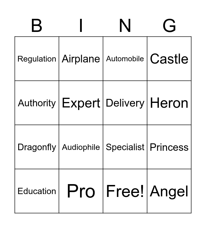 This bingo card has 17 words: Free!, Education, Automobile, Regulation, Audiophile, Castle, Princess, Delivery, Heron, Expert, Pro, Specialist, Authority, Airplane, Dragonfly, Chicken and Angel.