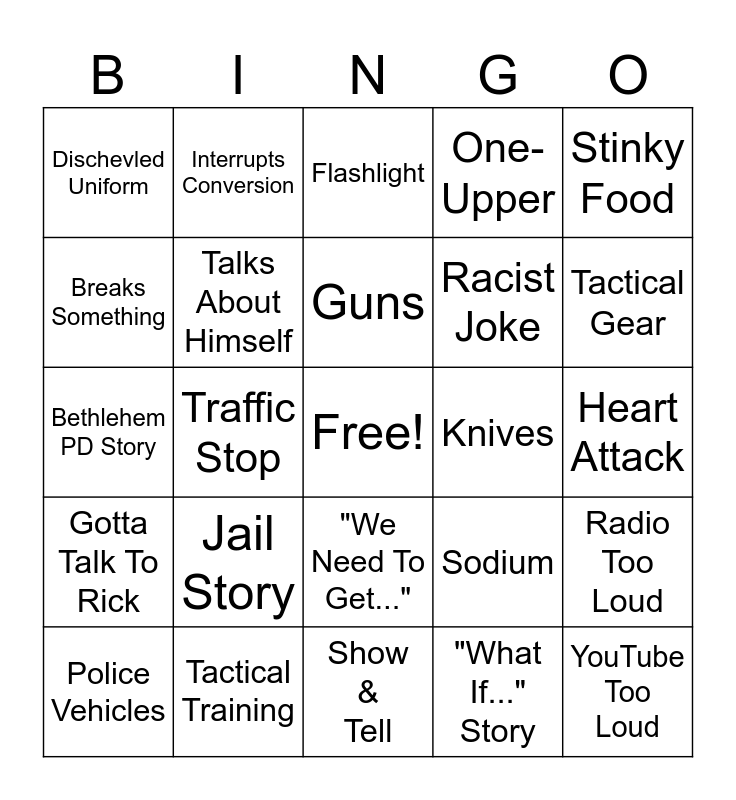 This bingo card has a free space and 24 words: Jail Story, Tactical Training, Guns, Police Vehicles, Stinky Food, Dischevled Uniform, Breaks Something, Interrupts Conversion, Knives, "We Need To Get...", Racist Joke, Bethlehem PD Story, Sodium, Radio Too Loud, Talks About Himself, "What If..." Story, Heart Attack, Flashlight, Tactical Gear, Traffic Stop, YouTube Too Loud, Gotta Talk To Rick, One-Upper and Show & Tell.
