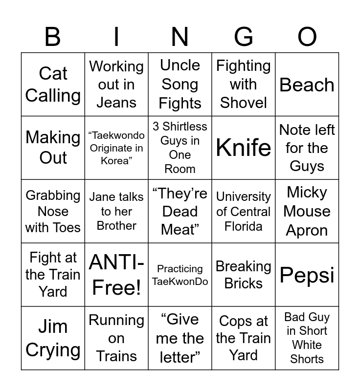 This bingo card has 25 words: ANTI-Free!, “Give me the letter”, 3 Shirtless Guys in One Room, Jim Crying, Beach, Cat Calling, Making Out, Working out in Jeans, University of Central Florida, Practicing TaeKwonDo, Knife, Grabbing Nose with Toes, Breaking Bricks, Pepsi, “Taekwondo Originate in Korea”, Bad Guy in Short White Shorts, Micky Mouse Apron, Uncle Song Fights, Note left for the Guys, Jane talks to her Brother, “They’re Dead Meat”, Running on Trains, Fight at the Train Yard, Fighting with Shovel and Cops at the Train Yard.