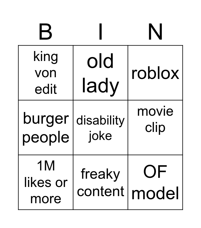 This bingo card has a free space and 8 words: movie clip, roblox, old lady, 1M likes or more, king von edit, OF model, burger people and freaky content.