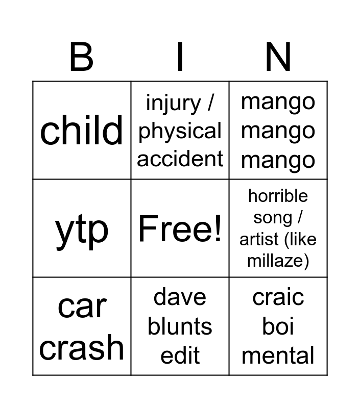 This bingo card has a free space and 14 words: chinese, faceapp singing, car crash, injury / physical accident, ytp, craic boi mental, kanye west aldi, music production (ben doesn't get it), dave blunts edit, child, "legendary" pull, horrible song / artist (like millaze), mango mango mango and "literal" memes.
