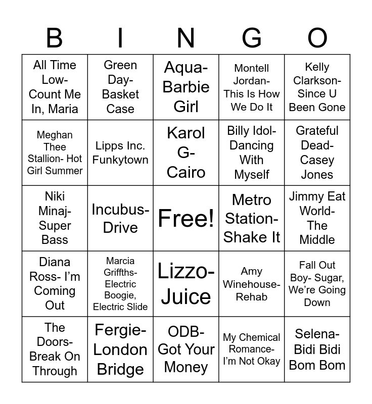 This bingo card has a free space and 27 words: Amy Winehouse- Rehab, Justin Beiber- Baby, Billy Idol- Dancing With Myself, ODB- Got Your Money, Meghan Thee Stallion- Hot Girl Summer, Aqua- Barbie Girl, Green Day- Basket Case, Diana Ross- I’m Coming Out, Metro Station- Shake It, Fall Out Boy- Sugar, We’re Going Down, Niki Minaj- Super Bass, Montell Jordan- This Is How We Do It, The Doors- Break On Through, Fergie- London Bridge, Grateful Dead- Casey Jones, The Clash- Train in Vain, Lipps Inc. Funkytown, Karol G- Cairo, Marcia Griffths- Electric Boogie, Electric Slide, All Time Low- Count Me In, Maria, Jimmy Eat World- The Middle, My Chemical Romance- I’m Not Okay, Incubus- Drive, Selena- Bidi Bidi Bom Bom, Lizzo- Juice, Kelly Clarkson- Since U Been Gone and BABYMETAL- Karate.