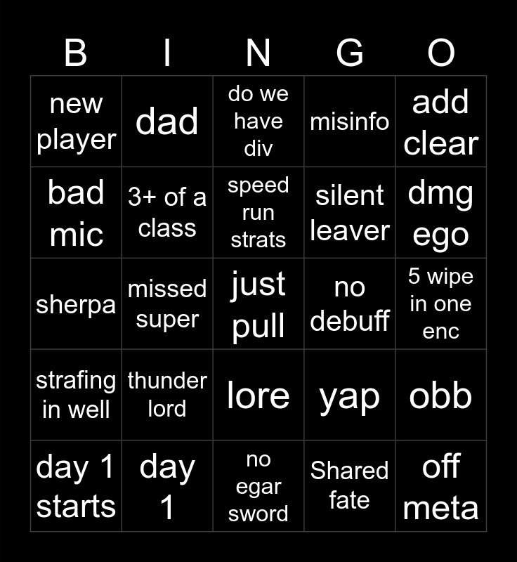 This bingo card has a free space and 24 words: thunder lord, day 1, speed run strats, day 1 starts, add clear, new player, bad mic, dad, no debuff, lore, silent leaver, sherpa, yap, obb, 3+ of a class, Shared fate, 5 wipe in one enc, do we have div, dmg ego, missed super, off meta, strafing in well, misinfo and no egar sword.