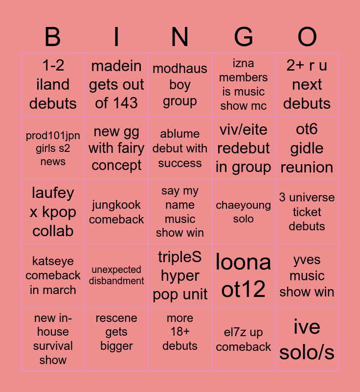 This bingo card has a free space and 24 words: unexpected disbandment, rescene gets bigger, ablume debut with success, new in-house survival show, 2+ r u next debuts, 1-2 iland debuts, prod101jpn girls s2 news, madein gets out of 143, chaeyoung solo, tripleS hyper pop unit, viv/eite redebut in group, laufey x kpop collab, loona ot12, yves music show win, new gg with fairy concept, el7z up comeback, 3 universe ticket debuts, modhaus boy group, ot6 gidle reunion, jungkook comeback, ive solo/s, katseye comeback in march, izna members is music show mc and more 18+ debuts.