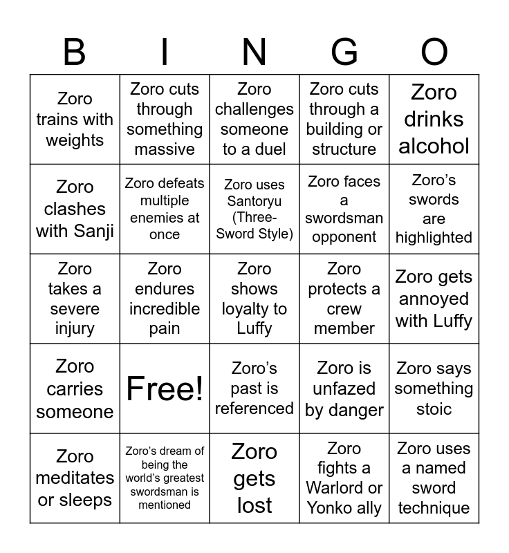This bingo card has 25 words: Free!, Zoro gets lost, Zoro uses Santoryu (Three-Sword Style), Zoro meditates or sleeps, Zoro drinks alcohol, Zoro trains with weights, Zoro clashes with Sanji, Zoro cuts through something massive, Zoro protects a crew member, Zoro’s past is referenced, Zoro faces a swordsman opponent, Zoro takes a severe injury, Zoro is unfazed by danger, Zoro says something stoic, Zoro defeats multiple enemies at once, Zoro uses a named sword technique, Zoro gets annoyed with Luffy, Zoro challenges someone to a duel, Zoro’s swords are highlighted, Zoro endures incredible pain, Zoro shows loyalty to Luffy, Zoro’s dream of being the world’s greatest swordsman is mentioned, Zoro carries someone, Zoro cuts through a building or structure and Zoro fights a Warlord or Yonko ally.