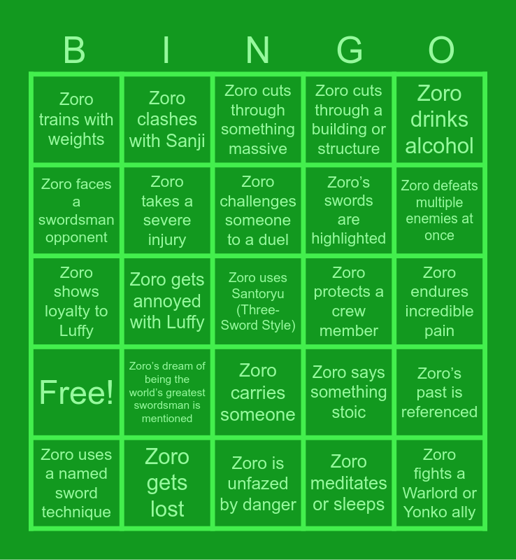 This bingo card has 25 words: Free!, Zoro gets lost, Zoro uses Santoryu (Three-Sword Style), Zoro meditates or sleeps, Zoro drinks alcohol, Zoro trains with weights, Zoro clashes with Sanji, Zoro cuts through something massive, Zoro protects a crew member, Zoro’s past is referenced, Zoro faces a swordsman opponent, Zoro takes a severe injury, Zoro is unfazed by danger, Zoro says something stoic, Zoro defeats multiple enemies at once, Zoro uses a named sword technique, Zoro gets annoyed with Luffy, Zoro challenges someone to a duel, Zoro’s swords are highlighted, Zoro endures incredible pain, Zoro shows loyalty to Luffy, Zoro’s dream of being the world’s greatest swordsman is mentioned, Zoro carries someone, Zoro cuts through a building or structure and Zoro fights a Warlord or Yonko ally.