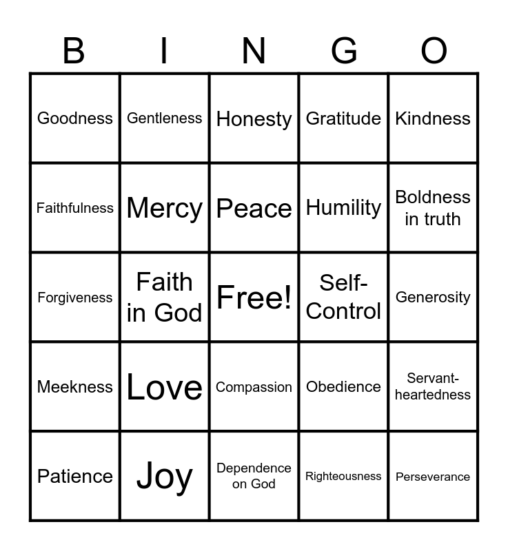 This bingo card has a free space and 24 words: Love, Joy, Peace, Patience, Kindness, Goodness, Faithfulness, Gentleness, Self-Control, Compassion, Humility, Forgiveness, Obedience, Servant-heartedness, Mercy, Righteousness, Generosity, Honesty, Boldness in truth, Faith in God, Perseverance, Meekness, Gratitude and Dependence on God.