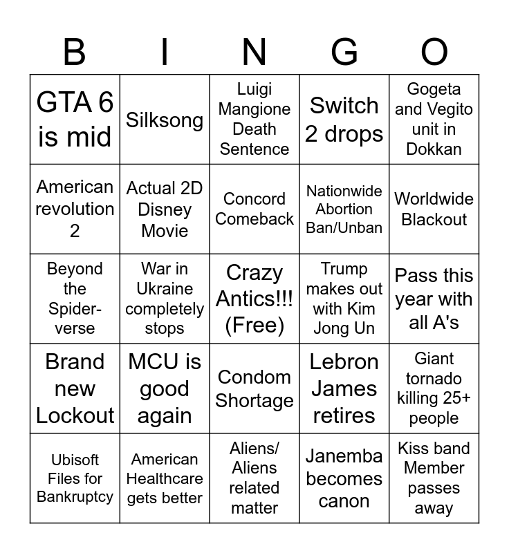 This bingo card has a free space and 24 words: Ubisoft Files for Bankruptcy, MCU is good again, Concord Comeback, Janemba becomes canon, Gogeta and Vegito unit in Dokkan, GTA 6 is mid, Silksong, Luigi Mangione Death Sentence, Trump makes out with Kim Jong Un, Pass this year with all A's, Beyond the Spider-verse, Actual 2D Disney Movie, Lebron James retires, Giant tornado killing 25+ people, American revolution 2, American Healthcare gets better, Aliens/ Aliens related matter, Switch 2 drops, Worldwide Blackout, Brand new Lockout, War in Ukraine completely stops, Condom Shortage, Nationwide Abortion Ban/Unban and Kiss band Member passes away.