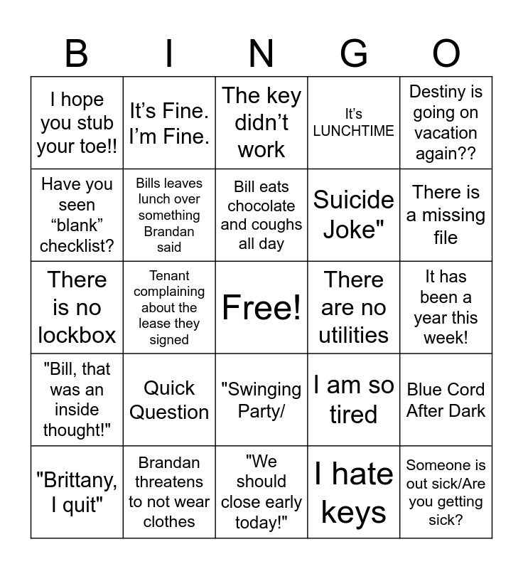 This bingo card has a free space and 24 words: Quick Question, Brandan threatens to not wear clothes, Bill eats chocolate and coughs all day, "Brittany, I quit", Destiny is going on vacation again??, I hope you stub your toe!!, Have you seen “blank” checklist?, It’s Fine. I’m Fine., There are no utilities, "Swinging Party/, Suicide Joke", There is no lockbox, I am so tired, Blue Cord After Dark, Bills leaves lunch over something Brandan said, I hate keys, It has been a year this week!, The key didn’t work, There is a missing file, Tenant complaining about the lease they signed, Someone is out sick/Are you getting sick?, "Bill, that was an inside thought!", It’s LUNCHTIME and "We should close early today!".