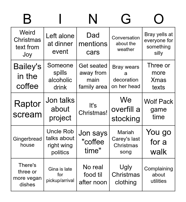 This bingo card has a free space and 24 words: Uncle Rob talks about right wing politics, Gina is late for pickup/arrival, Get seated away from main family area, There's three or more vegan dishes, Bray yells at everyone for something silly, Weird Christmas text from Joy, Bailey's in the coffee, Left alone at dinner event, We overfill a stocking, Jon says "coffee time", Bray wears a decoration on her head, Raptor scream, Mariah Carey's last Christmas song, You go for a walk, Someone spills alcoholic drink, Ugly Christmas clothing, Wolf Pack game time, Dad mentions cars, Three or more Xmas texts, Jon talks about project, Complaining about utilities, Gingerbread house, Conversation about the weather and No real food til after noon.