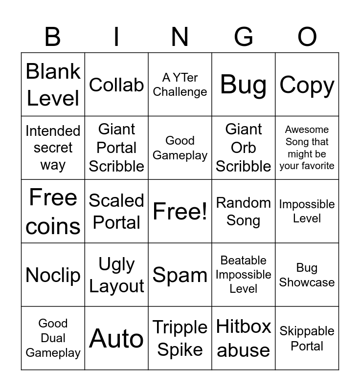 This bingo card has a free space and 24 words: Ugly Layout, Auto, Good Gameplay, Good Dual Gameplay, Copy, Blank Level, Intended secret way, Collab, Random Song, Spam, Giant Orb Scribble, Free coins, Beatable Impossible Level, Bug Showcase, Giant Portal Scribble, Hitbox abuse, Impossible Level, A YTer Challenge, Awesome Song that might be your favorite, Scaled Portal, Skippable Portal, Noclip, Bug and Tripple Spike.