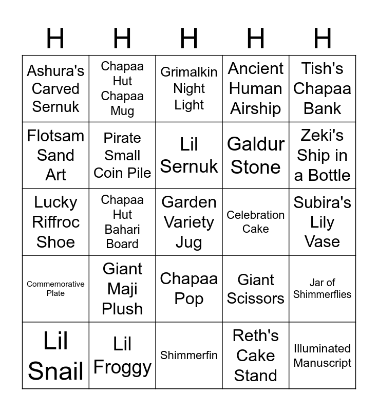 This bingo card has a free space and 24 words: Giant Maji Plush, Lil Froggy, Lil Sernuk, Lil Snail, Tish's Chapaa Bank, Ashura's Carved Sernuk, Flotsam Sand Art, Chapaa Hut Chapaa Mug, Celebration Cake, Chapaa Pop, Galdur Stone, Lucky Riffroc Shoe, Giant Scissors, Jar of Shimmerflies, Pirate Small Coin Pile, Reth's Cake Stand, Subira's Lily Vase, Grimalkin Night Light, Zeki's Ship in a Bottle, Chapaa Hut Bahari Board, Illuminated Manuscript, Commemorative Plate, Ancient Human Airship and Shimmerfin.
