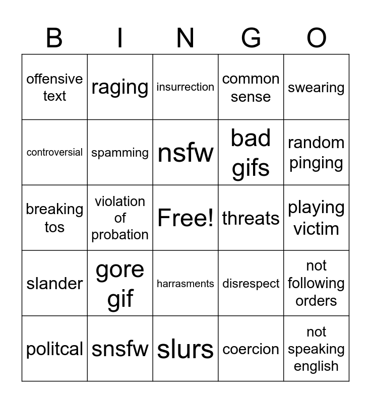 This bingo card has a free space and 24 words: gore gif, snsfw, nsfw, politcal, swearing, offensive text, controversial, raging, threats, harrasments, bad gifs, breaking tos, disrespect, not following orders, spamming, coercion, playing victim, insurrection, random pinging, violation of probation, not speaking english, slander, common sense and slurs.