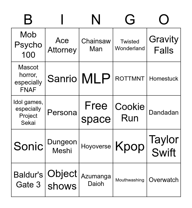 This bingo card has a free space and 24 words: Dungeon Meshi, Object shows, MLP, Baldur's Gate 3, Gravity Falls, Mob Psycho 100, Mascot horror, especially FNAF, Ace Attorney, Cookie Run, Hoyoverse, ROTTMNT, Idol games, especially Project Sekai, Kpop, Taylor Swift, Sanrio, Mouthwashing, Dandadan, Chainsaw Man, Homestuck, Persona, Overwatch, Sonic, Twisted Wonderland and Azumanga Daioh.