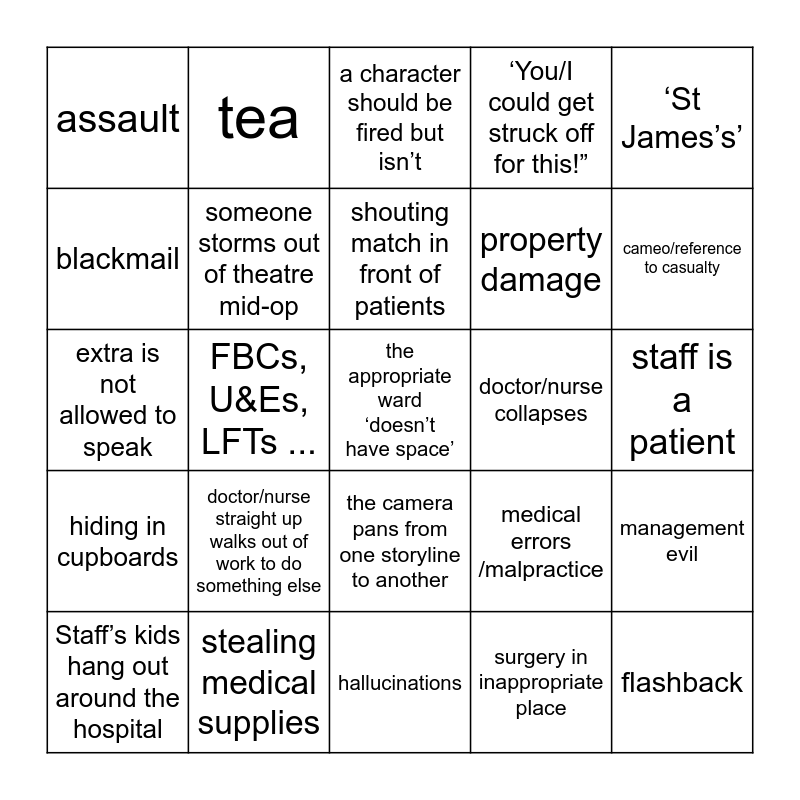 This bingo card has 35 words: Free Space (inappropriate work relationships), ‘can I get some help in here?’, relative of staff is a patient, someone storms out of theatre mid-op, the camera pans from one storyline to another, ‘You/I could get struck off for this!”, blackmail, locked in a cupboard/ lift/basement, shouting match in front of patients, dramatic character does voiceover, extra is not allowed to speak, ‘St James’s’, a patient gets hold of a scalpel, rousing speech about importance of the NHS, assault, doctor/nurse collapses, surgery in inappropriate place, FBCs, U&Es, LFTs ..., hiding in cupboards, the appropriate ward ‘doesn’t have space’, medical errors /malpractice, Staff’s kids hang out around the hospital, management evil, stealing medical supplies, a character should be fired but isn’t, cameo/reference to casualty, flashback, episode begins and then goes back in time, property damage, staff is a patient, kian gives someone a nickname, hallucinations, doctor/nurse straight up walks out of work to do something else, tea and death.