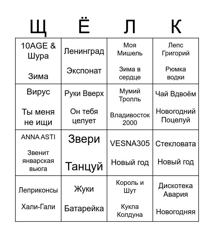 This bingo card has 16 words: Жуки Батарейка, Стекловата Новый год, Моя Мишель Зима в сердце, 10AGE & Шура Зима, ANNA ASTI Звенит январская вьюга, Ленинград Экспонат, VESNA305 Новый год, Король и Шут Кукла Колдуна, Вирус Ты меня не ищи, Руки Вверх Он тебя целует, Леприконсы Хали-Гали, Лепс Григорий Рюмка водки, Звери Танцуй, Чай Вдвоём Новогодний Поцелуй, Мумий Тролль Владивосток 2000 and Дискотека Авария Новогодняя.