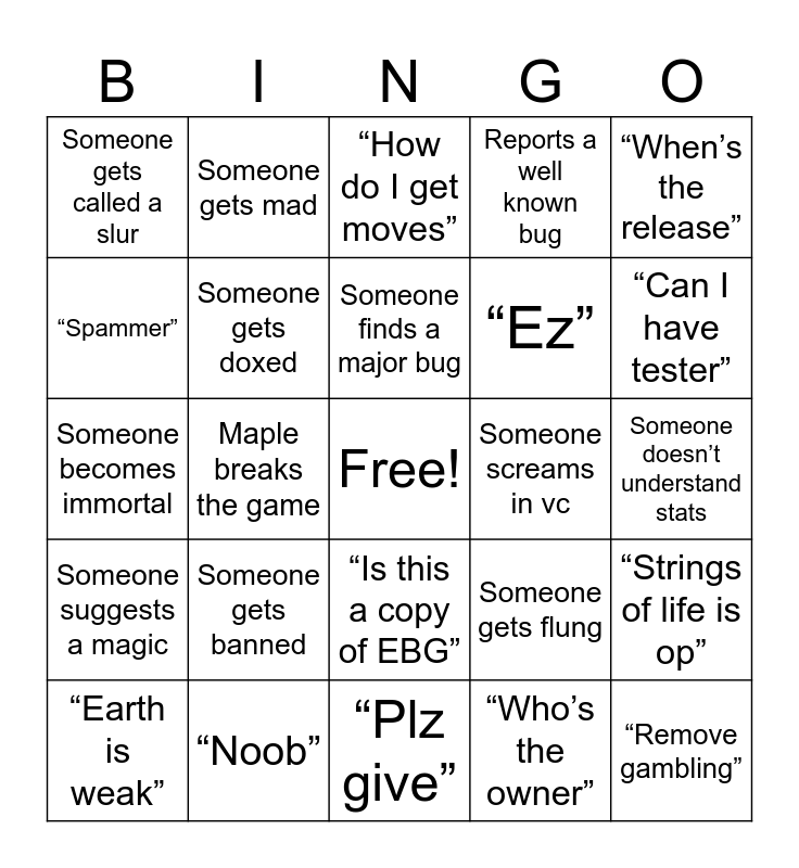 This bingo card has a free space and 24 words: Someone gets banned, “Noob”, Someone finds a major bug, “Earth is weak”, “When’s the release”, Someone gets called a slur, “Spammer”, Someone gets mad, Someone screams in vc, “Is this a copy of EBG”, “Ez”, Someone becomes immortal, Someone gets flung, “Strings of life is op”, Someone gets doxed, “Who’s the owner”, Someone doesn’t understand stats, “How do I get moves”, “Can I have tester”, Maple breaks the game, “Remove gambling”, Someone suggests a magic, Reports a well known bug and “Plz give”.