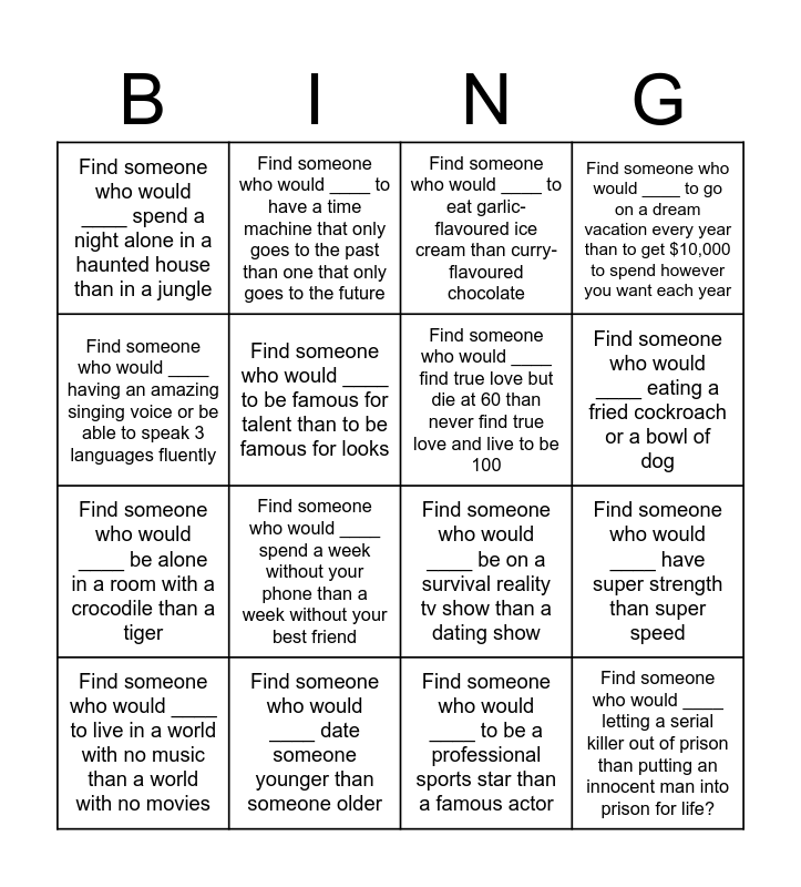 This bingo card has 16 words: Find someone who would ____ date someone younger than someone older, Find someone who would ____ have super strength than super speed, Find someone who would ____ to eat garlic-flavoured ice cream than curry-flavoured chocolate, Find someone who would ____ spend a night alone in a haunted house than in a jungle, Find someone who would ____ be alone in a room with a crocodile than a tiger, Find someone who would ____ to have a time machine that only goes to the past than one that only goes to the future, Find someone who would ____ be on a survival reality tv show than a dating show, Find someone who would ____ to be a professional sports star than a famous actor, Find someone who would ____ having an amazing singing voice or be able to speak 3 languages fluently, Find someone who would ____ to be famous for talent than to be famous for looks, Find someone who would ____ to live in a world with no music than a world with no movies, Find someone who would ____ to go on a dream vacation every year than to get $10,000 to spend however you want each year, Find someone who would ____ spend a week without your phone than a week without your best friend, Find someone who would ____ eating a fried cockroach or a bowl of dog, Find someone who would ____ find true love but die at 60 than never find true love and live to be 100 and Find someone who would ____ letting a serial killer out of prison than putting an innocent man into prison for life?.