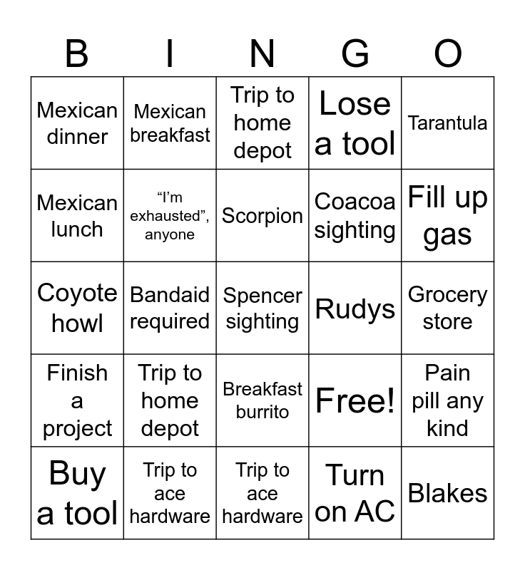 This bingo card has 25 words: Trip to home depot, Trip to ace hardware, Scorpion, Buy a tool, Tarantula, Mexican dinner, Mexican lunch, Mexican breakfast, Rudys, Breakfast burrito, Coacoa sighting, Coyote howl, Free!, Pain pill any kind, “I’m exhausted”, anyone, Blakes, Grocery store, Trip to home depot, Fill up gas, Bandaid required, Spencer sighting, Trip to ace hardware, Finish a project, Lose a tool and Turn on AC.