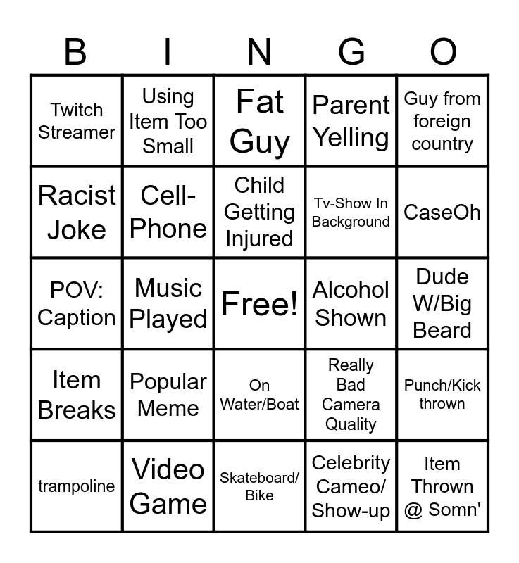 This bingo card has a free space and 24 words: Popular Meme, Video Game, Child Getting Injured, trampoline, Guy from foreign country, Twitch Streamer, Racist Joke, Using Item Too Small, Alcohol Shown, On Water/Boat, Tv-Show In Background, POV: Caption, Really Bad Camera Quality, Punch/Kick thrown, Cell-Phone, Celebrity Cameo/ Show-up, Dude W/Big Beard, Fat Guy, CaseOh, Music Played, Item Thrown @ Somn', Item Breaks, Parent Yelling and Skateboard/ Bike.