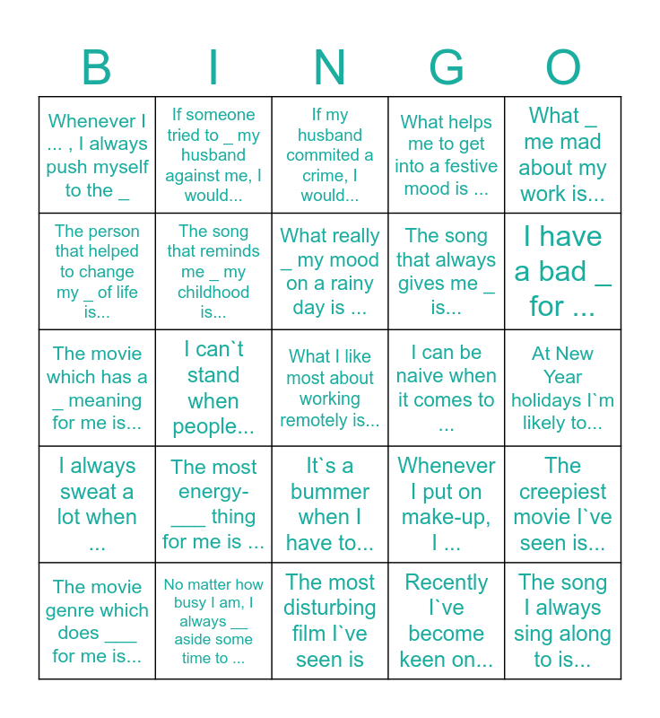 This bingo card has a free space and 24 words: The most energy-___ thing for me is ..., No matter how busy I am, I always __ aside some time to ..., What really _ my mood on a rainy day is ..., The movie genre which does ___ for me is..., What _ me mad about my work is..., Whenever I ... , I always push myself to the _, The person that helped to change my _ of life is..., If someone tried to _ my husband against me, I would..., I can be naive when it comes to ..., It`s a bummer when I have to..., The song that always gives me _ is..., The movie which has a _ meaning for me is..., Whenever I put on make-up, I ..., The creepiest movie I`ve seen is..., The song that reminds me _ my childhood is..., Recently I`ve become keen on..., At New Year holidays I`m likely to..., If my husband commited a crime, I would..., I have a bad _ for ..., I can`t stand when people..., The song I always sing along to is..., I always sweat a lot when ..., What helps me to get into a festive mood is ... and The most disturbing film I`ve seen is.