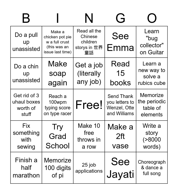 This bingo card has a free space and 25 words: Try Grad School, 25 job applications, Get a job (literally any job), Finish a half marathon, Learn "bug collector" on Guitar, Do a pull up unassisted, Do a chin up unassisted, Make a chicken pot pie w a full crust (this was an issue last time), Send Thank you letters to Wenzel, Otte and Williams, Make 10 free throws in a row, Read 15 books, Get rid of 3 uhaul boxes worth of stuff, Make a 2ft vase, Write a story (>8000 words), Make soap again, Finish drawing original 151 pokemon, Memorize the periodic table of elements, Read all the Chinese children storys in 世界童話, Learn a new way to solve a rubics cube, Reach a 100wpm typing score on type racer, Choreograph & dance a full song, Memorize 100 digits of pi, Fix something with sewing, See Emma and See Jayati.